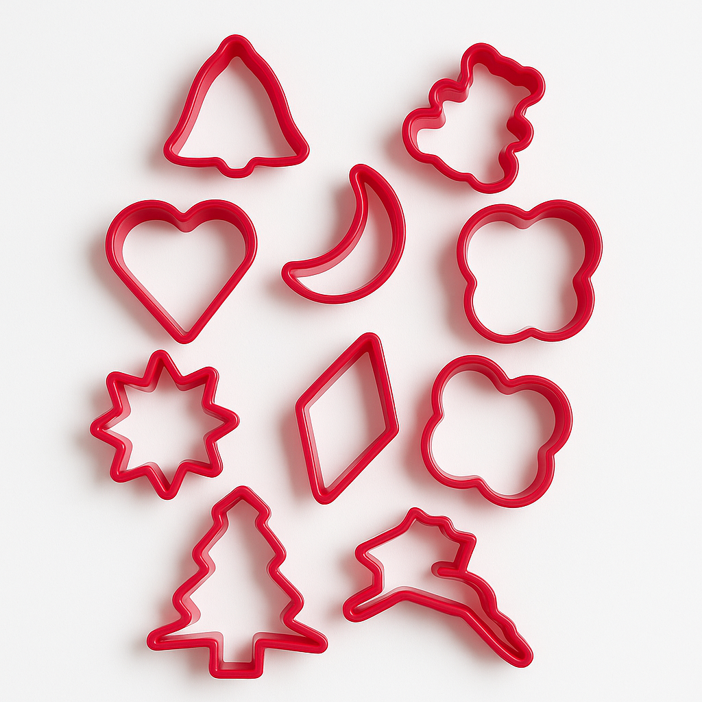 Set de 10 forme din plastic roșu pentru decupat biscuiți și prăjituri, cu diverse modele festive și creative.