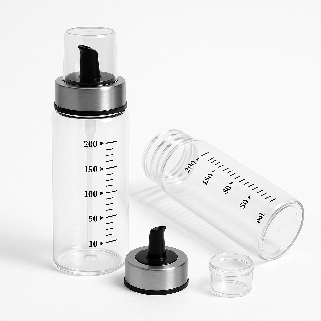 Sticle transparente cu gradare și dozator, ideale pentru ulei, oțet sau sosuri etc. Design modern și practic pentru bucătărie